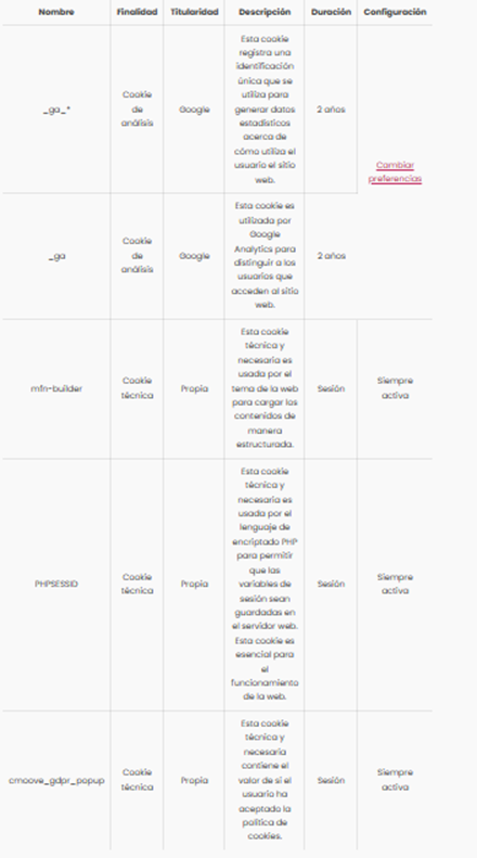 Se informa al usuario sobre el tipo de cookies que están siendo utilizadas en esta página web, así como su finalidad, procedencia/titularidad y duración:
